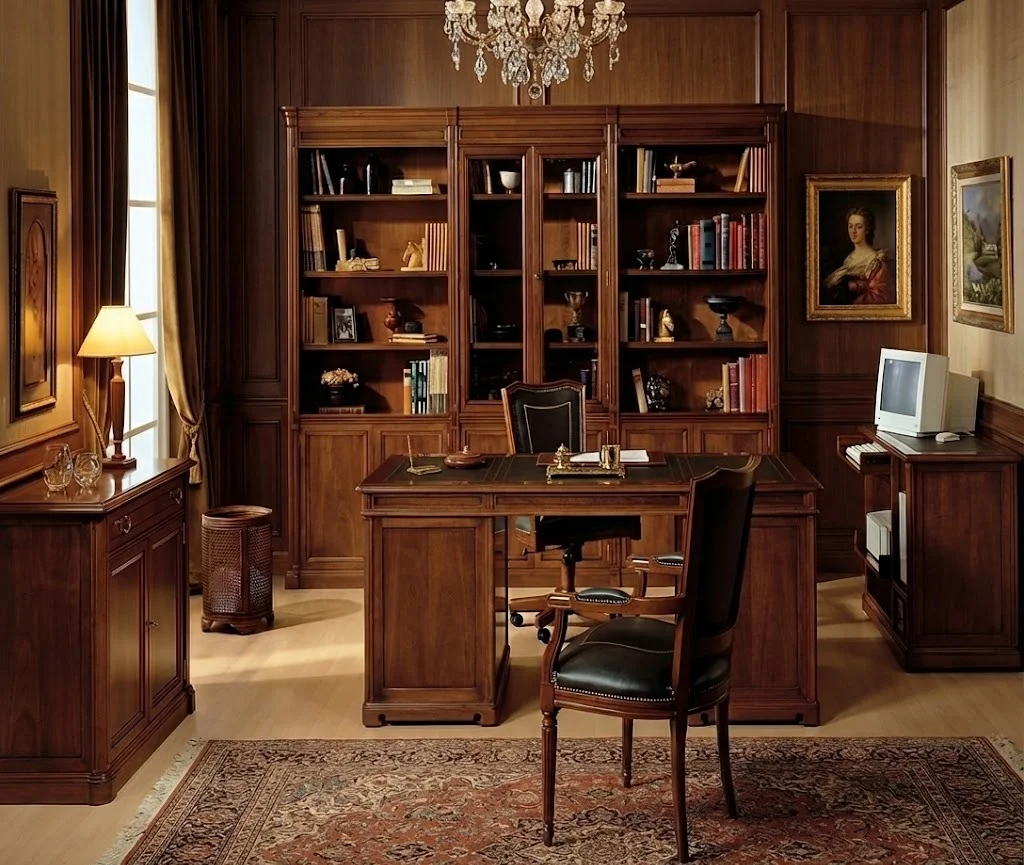 Esta mesa de escritorio clásica en chapa de cerezo es una pieza imponente que aporta carácter, funcionalidad y elegancia a cualquier despacho. Su diseño de líneas rectas, con molduras decorativas y acabados artesanales, está pensado para ofrecer una estética atemporal y profesional, ideal tanto para oficinas como para despachos privados en el hogar.