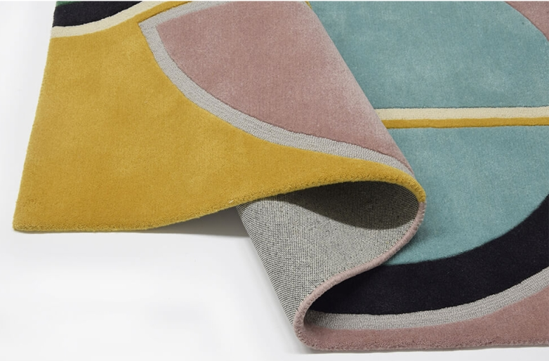 Fabricada en 100% lana, un material natural, resistente y duradero, esta alfombra ayuda a conservar el confort térmico y mejora la acústica del espacio. Su diseño multicolor con formas geométricas y colores bien equilibrados aporta dinamismo y sofisticación sin recargar el ambiente.
