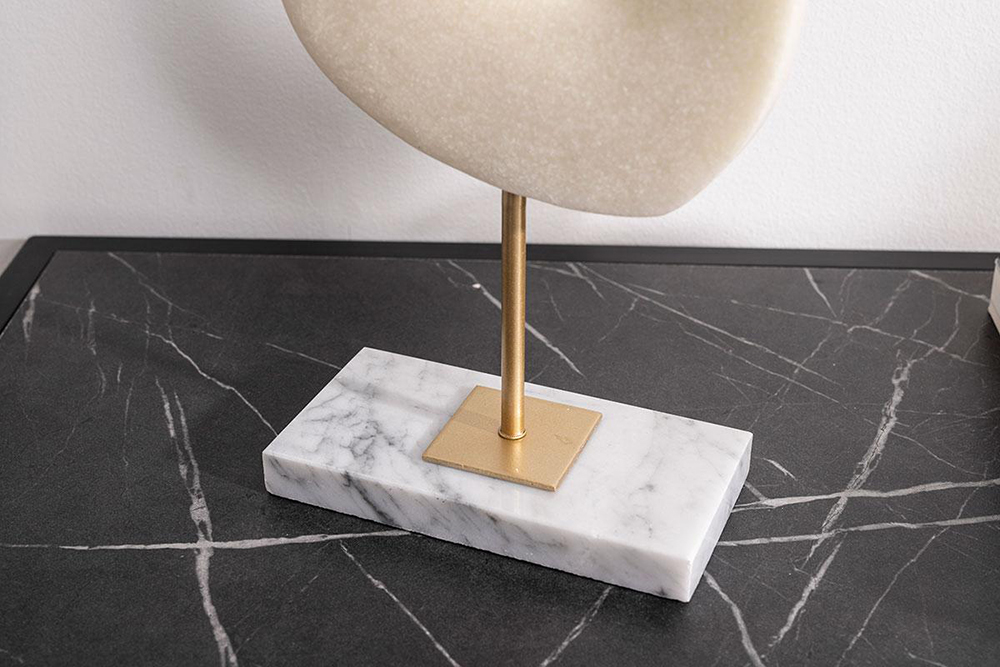 Elaborada en resina efecto mármol blanco, se alza sobre una base de mármol natural con soporte metálico en acabado dorado, lo que le da un contraste sofisticado y una presencia única. Su diseño la convierte en una opción versátil para interiores modernos, nórdicos o de inspiración artística.