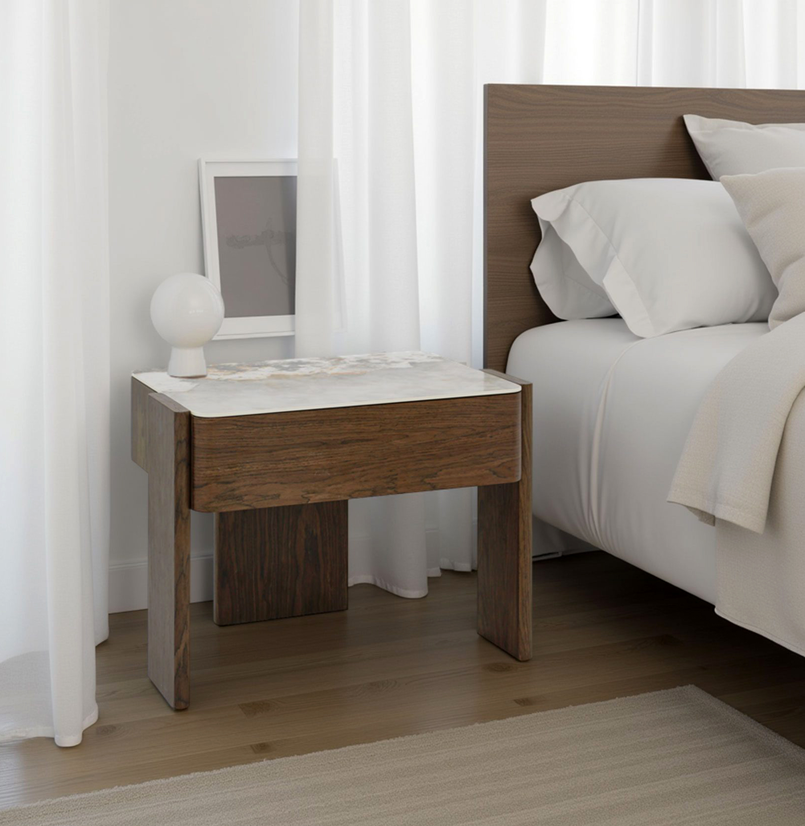La mesa de noche Grat combina la calidez del nogal natural con la sofisticación del porcelánico efecto mármol, creando una pieza de mobiliario elegante y funcional. Su diseño limpio y líneas rectas la convierten en el complemento perfecto para dormitorios modernos, minimalistas o de estilo escandinavo.