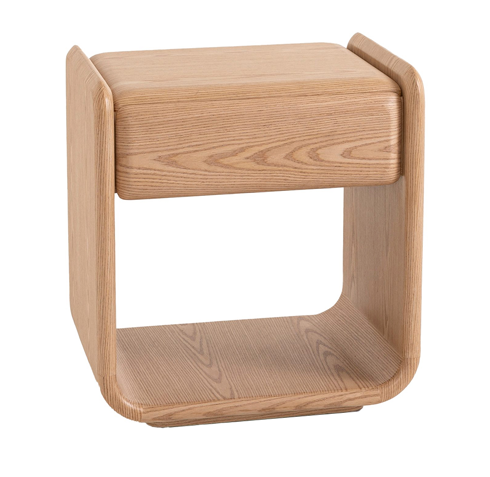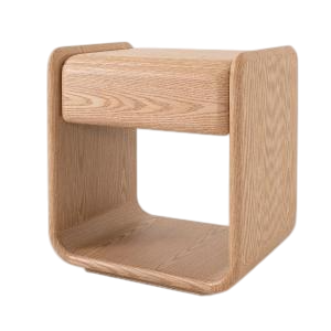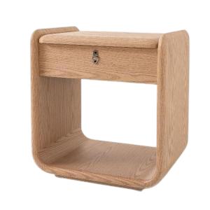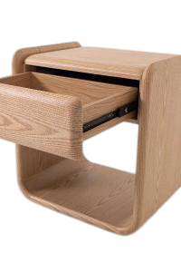 La mesa de noche Curby destaca por su diseño orgánico y minimalista, elaborado en madera de roble clara con esquinas redondeadas que aportan suavidad visual y un acabado contemporáneo. Su estilo versátil la convierte en una pieza ideal para dormitorios escandinavos, japoneses (Japandi) o modernos.
