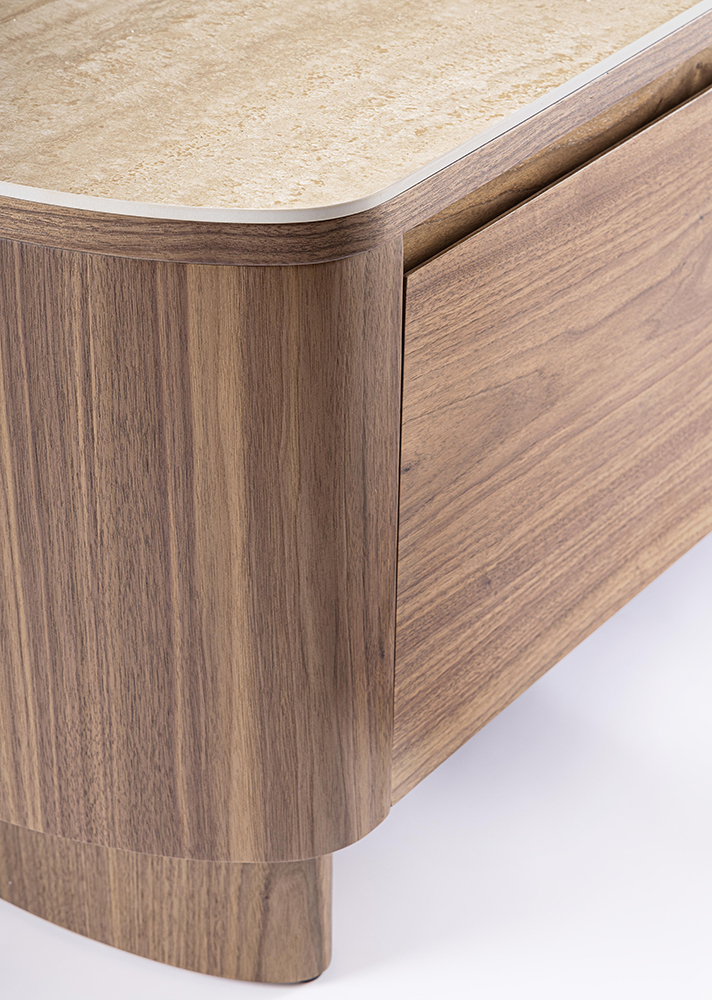 Mueble con estructura y patas de DM chapado en auténtica madera de nogal, con acabado en pintura de poliuretano para mayor resistencia y durabilidad. Superficie superior en piedra sinterizada con efecto travertino, una piedra natural tratada a alta temperatura que aporta elegancia y robustez. Incorpora puertas y cajones con bisagras de cierre suave para un uso silencioso y cómodo. Patas incluidas para un montaje sencillo.