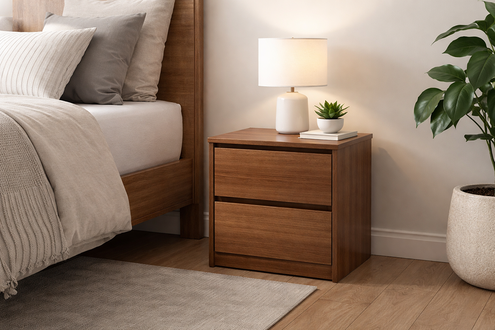 Esta mesa de noche de 2 cajones con cajón secreto combina diseño, funcionalidad y un extra de seguridad, convirtiéndose en una pieza ideal para dormitorios contemporáneos y proyectos de interiorismo cuidados al detalle.