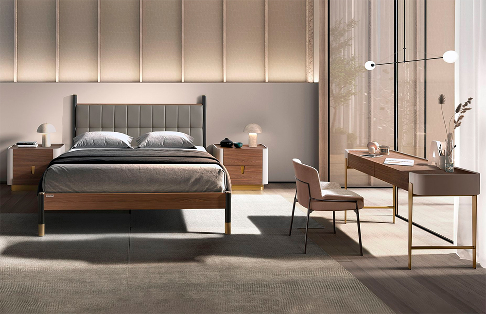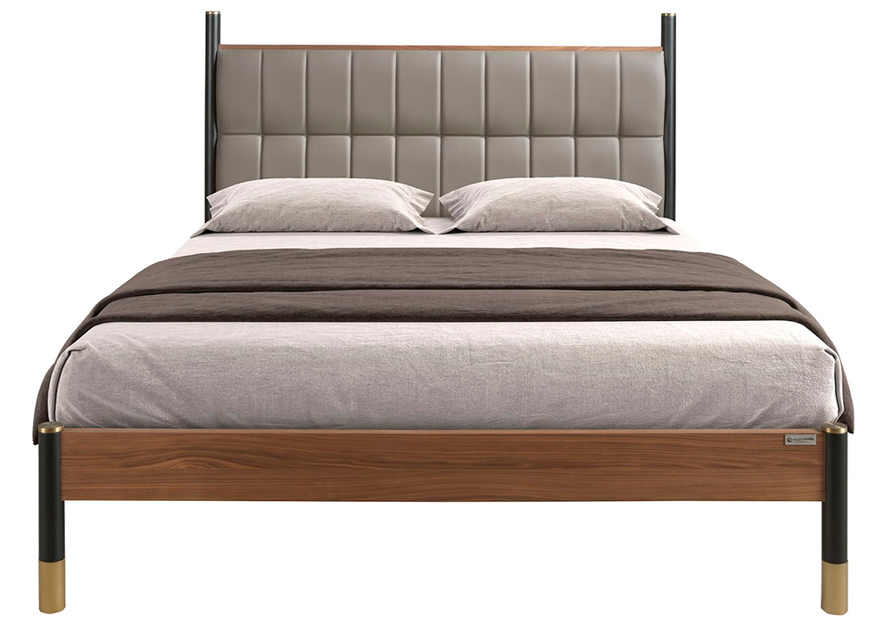 Cama de matrimonio moderna con cabecero en polipiel gris oscuro y estructura en nogal natural