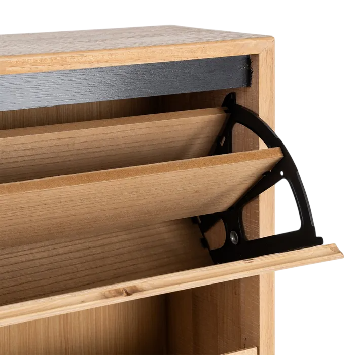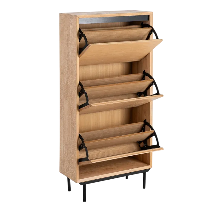 El zapatero cuenta con tres compartimentos abatibles, cada uno con un sistema interior metálico que permite organizar varios pares de zapatos de forma accesible y ventilada. Cada cajón mide 56 × 33 cm, ofreciendo un buen espacio para calzado del día a día.