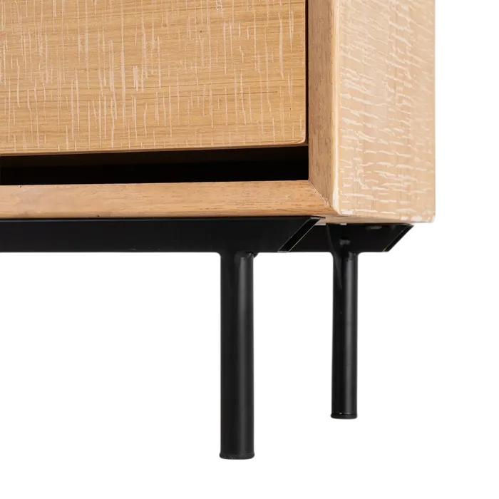 Este zapatero de diseño moderno combina madera en acabado natural con detalles y patas en metal negro, creando una pieza funcional y elegante ideal para mantener el orden en el recibidor, dormitorio o vestidor. Su estructura está fabricada en madera de caucho, DM y metal, lo que le aporta solidez y durabilidad, mientras que sus patas de hierro negras, de 11,5 cm de altura, elevan el mueble y le dan un toque ligero y contemporáneo.