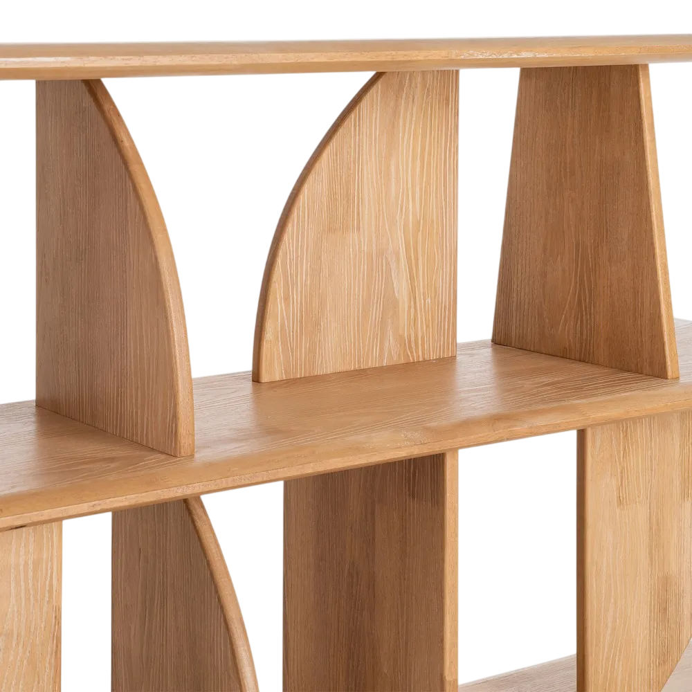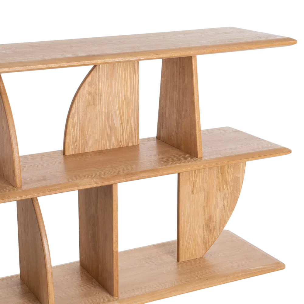 Esta estantería está fabricada en madera de caucho con un acabado natural que resalta la veta y aporta una sensación cálida y orgánica. Su diseño es moderno y escultórico, combinando líneas rectas con paneles curvos que actúan como soporte y elemento decorativo. Consta de tres niveles horizontales unidos por divisores verticales y piezas semicirculares colocadas de forma alternada, creando compartimentos visualmente interesantes y una estructura equilibrada. Los bordes de las baldas son suavemente redondeados, lo que añade una sensación de fluidez al conjunto. Mide 180 cm de ancho, 38 cm de fondo y 83 cm de alto. Su estética minimalista y geométrica la hace ideal para salones, estudios o espacios contemporáneos donde se busque una pieza funcional y decorativa al mismo tiempo.