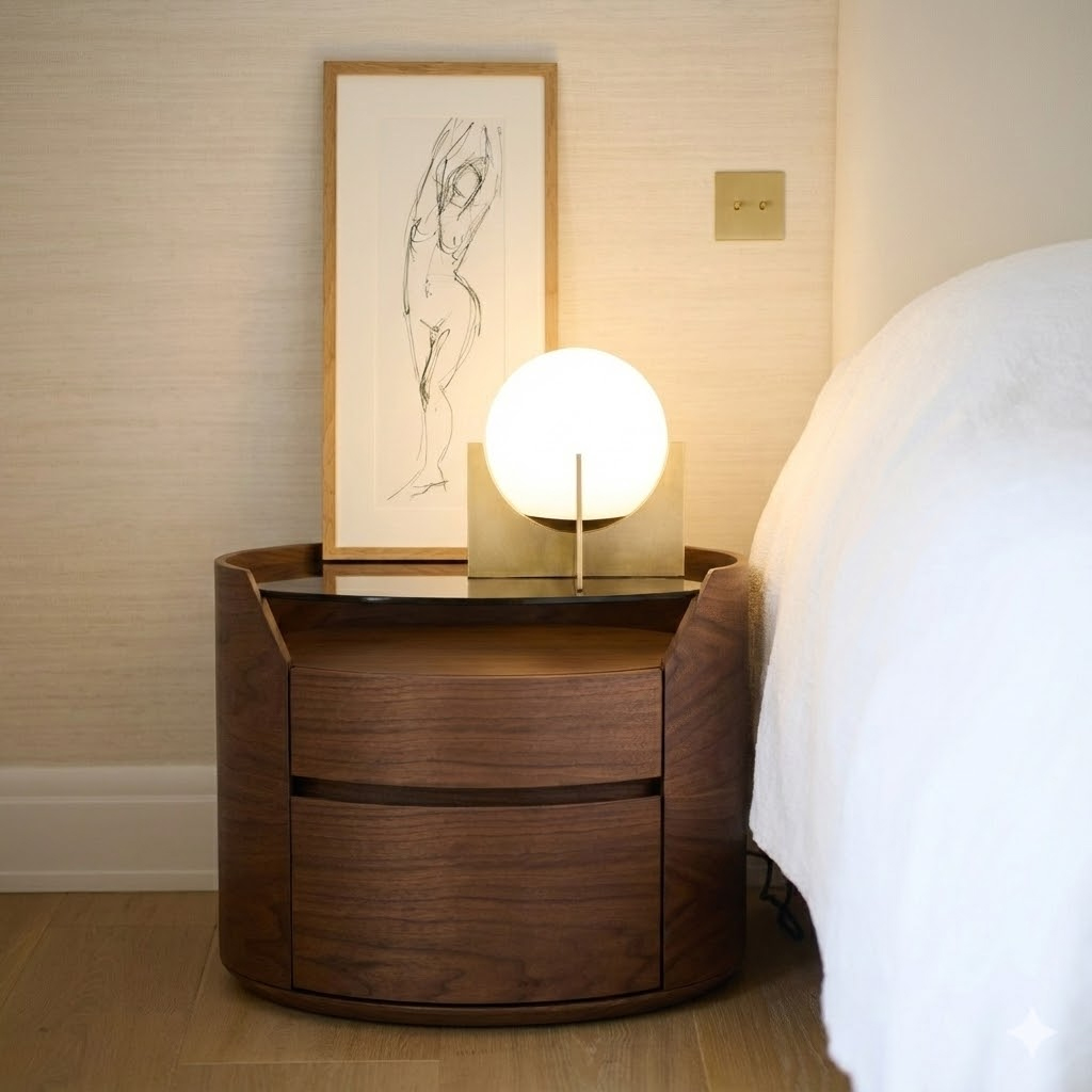 Esta mesita de noche marrón combina madera natural, cristal transparente y cerámica blanca para dar vida a una pieza de diseño moderno y sofisticado. Su estructura redondeada suaviza el espacio, mientras que sus líneas limpias y materiales nobles aportan una presencia cálida y contemporánea.