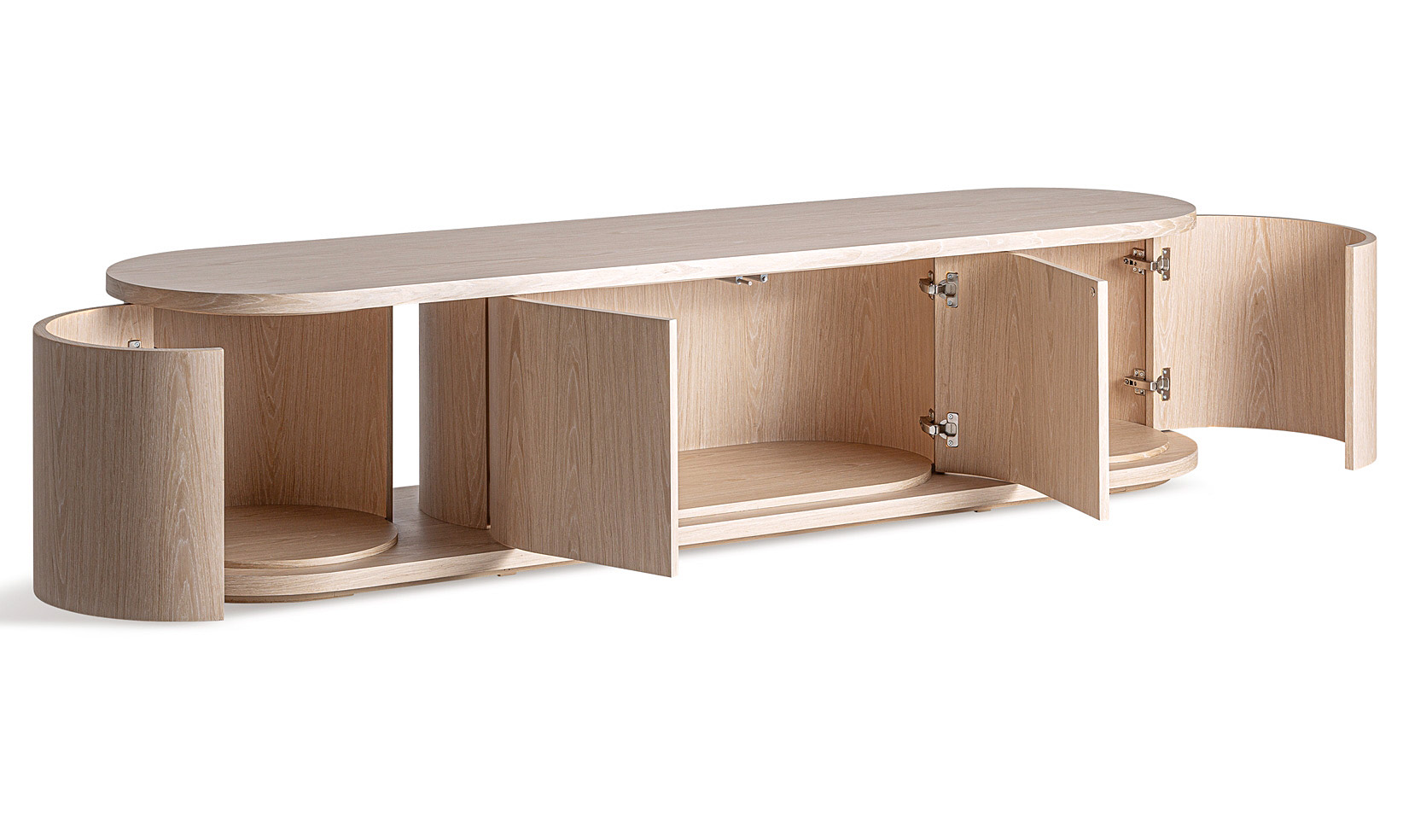 Su estructura está compuesta por módulos con puertas curvas abatibles, que envuelven el mueble y crean una transición armoniosa entre los distintos volúmenes. Los compartimentos interiores ofrecen un almacenamiento práctico y discreto, perfecto para mantener ordenados dispositivos, accesorios o decoración. La parte superior, amplia y estilizada, permite colocar con comodidad un televisor de gran formato sin saturar el espacio.